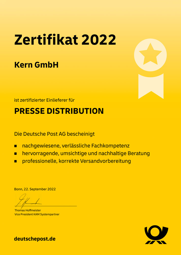 Zertifizierte Partner der Deutschen Post gewährleisten eine professionelle Versandvorbereitung und eine Porto optimierte Einlieferung von Sendungen. Seit 2006 ist die Kern GmbH Performance Partner der Deutschen Post. Hinzu kommen Zertifizierungen als geprüfter Einlieferer Brief International, Dialogpost und Dialogpost E+KW, Postaktuell, Postwurfspezial, Presse Distribution sowie eine Reihe zertifizierter Mailings mit DV-Freimachung.