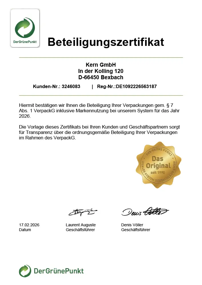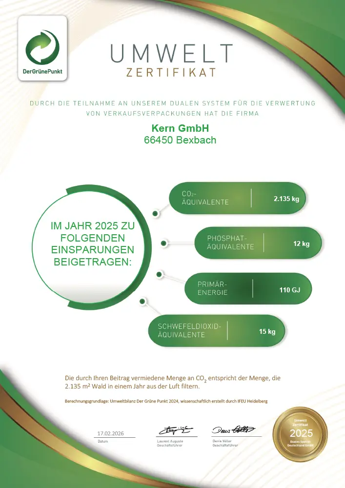 Durch die Teilnahme am Dualen System des Grünen Punktes zur Wiederverwertung von Verkaufsverpackungen hat die Kern GmbH im Jahr 2024 rund 1.976 kg CO2-Äquivalente eingespart. Ebenso konnten so 11 kg Phosphat-Äquivalente, 14 kg Schwefeldioxid-Äquivalente und 102 GJ Primärenergie eingespart werden. Als Berechnungsgrundlage dient die Umweltbilanz Der Grüne Punkt 2023, wissenschaftlich erstellt durch IFEU Heidelberg.